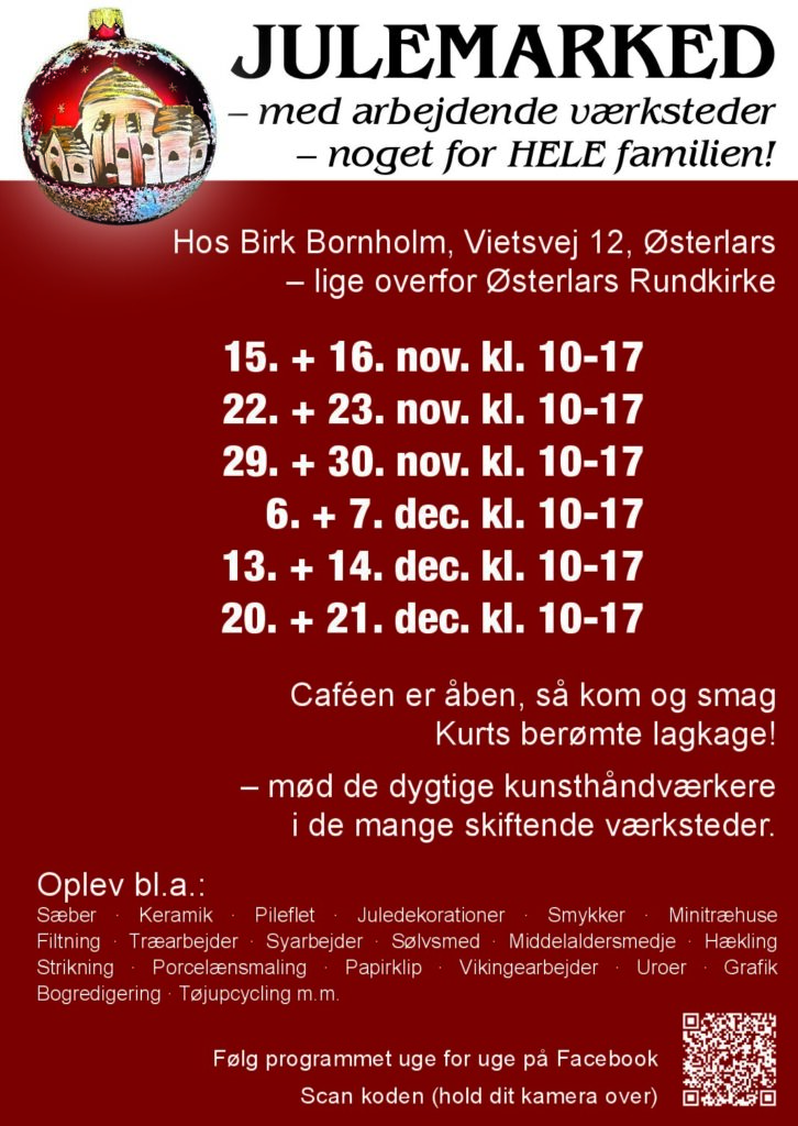 Oplev bl.a.: Sæber – keramik – pileflet – juledekorationer – smykker – minitræhuse – filtning – træarbejder – syarbejder – sølvsmed – middelaldersmedje – hækling – strikning – porcelænsmaling – papirklip – vikingearbejder – uroer – grafik – bogredigering – tøjupcycling m.m.