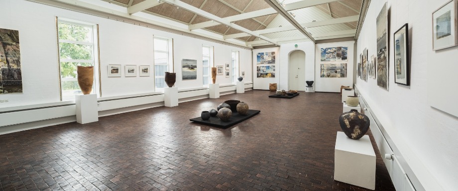 viser skiftende udstillinger med fokus på bornholmsk kunst og kunsthåndværk i den lyse og indbydende udstillingssal.